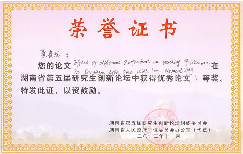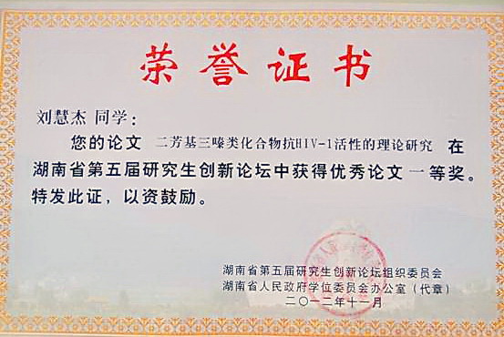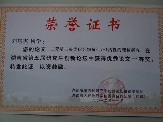 在湖南省第五届研究生创新论坛中,我院10级研究生刘慧杰同学的论文《二芳基三嗪类化合物抗HIV-1活性的理论研究》在研究生创新论坛中荣获一等奖;蔡贵龙同学的论文《Effect of different Surfactant on Leaching of Uranium in Sandstone type Ores with Low Permeability》荣获三等奖。他们的论文分别由我院的聂长明老师和谭凯旋老师指导。在我校“第六届研究生楚岳节研究生学术报告竞赛”中,刘慧杰同学获得二等奖。研究生创新论坛两个奖项的获得,是我院研究生继2008年陈炫同学获一等奖后在学术研究上的又一次突破,体现了化工学院学子在化学科学研究方面取得的重大进步和我院老师的辛勤指导。