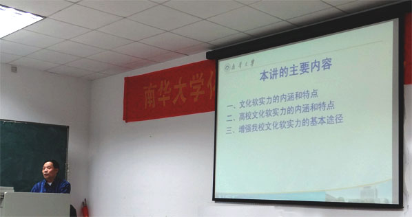 张多来教授从文化软实力的内涵、文化软实力的基本特点、增强文化软实力的途径等方面联系高校文化建设、地域文化特点优势等实际情况,从五个方面详细解释了增强文化软实力的途径,由自发的文化意识向文化自觉转化、由文化观念形态向文化的实践形态转化、由文化资源向文化软实力转化、由价值理念向价值表现方式转化、由民族文化向世界文化转化。大学处在国家文化软实力的战略地位,大学是文化传承的主导渠道,大学是文化创新的重要基地,通过对大学文化软实力建设存在问题的探讨,寻找出增强高校文化软实力的基本途径。现场的教职工和同学通过讲座也对南华大学形象识别系统的内容进行了再学习。