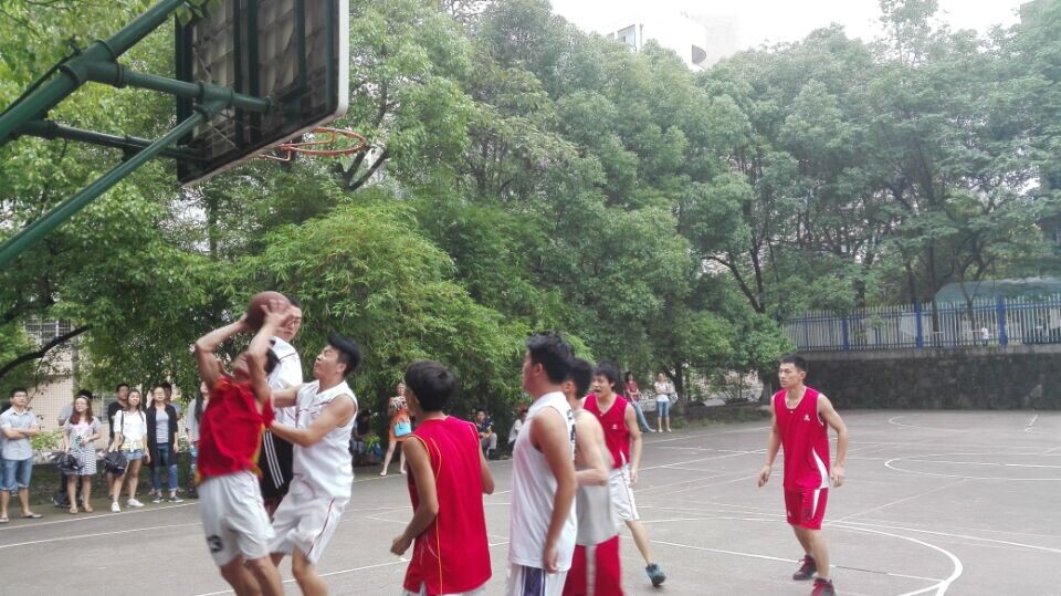 裁判哨声响,比赛顺时开。第一节开始,红方12级高材联队7号球员连中三球,狂砍六分将比赛拉向高潮,11级化工联队并未放弃,积极组织防守,“人盯人”、“二三联防”两种防守队形交替转换,一步步将比分拉近。14级高材2班代表队和14级无机1班代表队的比赛气氛相对缓和,你攻我守,欢笑连连。上半场结束,13级高材联队和14级无机1班代表队分别以22比21和22比18的微弱优势领先。短暂的休息之后,比赛继续,细雨开始转向小雨,场地越发湿滑,比赛也更加精彩,观看比赛的观众一阵呐喊盖过一阵呐喊,加油声不断。随着时间的流逝,14级无机1班代表队率先以46比33的大比分领先结束比赛。而11级化工联队和12级高材联队的比赛就相对激烈,比赛还剩一分钟,双方比分为45比43,11级化工联队实现本场比赛的第一次领先,双方观众格外激动,球员更是丝毫不敢放松警惕。比赛结束的哨声响起,12级高材联队并未突破11级化工联队的严防死守,比赛以45比43的微弱分差结束。11级化工联队获得15年“化工杯”篮球赛冠军,12级化工联队和14级无机1班代表队分别获得季亚军。