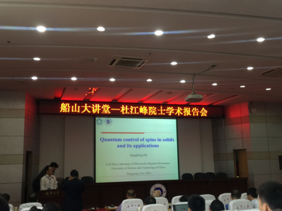 2016年10月22日上午,中国科学院院士,国家重大科学研究计划项目首席科学家杜江峰院士做客我校“船山大讲堂”,为我校师生做了题为“Quantum control of spins in solids and its applications”的精彩学术报告,报告会由副校长龚学余教授主持,到会人员200余人,包括化工、数理、电气、核技术学院的老师、研究生,科技处的相关领导也参加此次报告会。