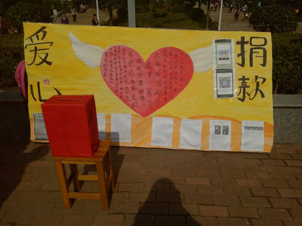 各位父老乡亲,各界爱心人士: 您们好!我叫**,现就读与南华大学,是ok138cn太阳集团制药工程三班的一员,湖南娄底人。我们家是做门窗装修生意的,印象中,父亲和母亲总是特别的卖力地工作。三年前,我父亲患上了尿毒症,母亲捐肾给父亲,但是手术后母亲的肾在父亲体内出现了排斥反应,那年的换肾手术失败了。这几年来,我父亲一直靠做血液透析排出体内毒素与代谢废物,艰难地维持生命。前两年,父亲去市里医院做血液透析的时间间隔是三四天,但是今年来,父亲的病情加剧了,每隔一两天就要去医院做透析排毒。两个月前,父亲晕倒在地,一边抽搐一边口吐白沫,紧急送往医院,被诊断出是癫痫病。更严重的是,因为父亲患尿毒症身体免疫能力下降,被诊断出患有浸润性肺结核,这给我们家治好父亲的病的愿望浇上了一盆冰水。最近几天,我母亲哭着打电话告诉我,父亲的病情又加剧了。在我父亲心脏内血液流动快的地方,有一个一厘米大的血栓贴在心脏壁上,因为肺结核咳血不能保守治疗,此外又诊断出了心脏三尖瓣关闭不全,随时会有生命危险。医生告诉我妈,目前做手术是可能救活我父亲的唯一希望,因为一旦血栓脱落,血小板又低,可能到时候连抢救都来不及。 医生估计心脏血栓手术需要花费10万元的手术费,加上做心脏三尖瓣的手术和后续医药费用,巨大的开销让这个原本就困难的家庭陷入了绝望,父亲一直是家里的经济支柱,父亲倒下后,家中没有了经济来源。家中三个孩子的学费和生活费,以及庞大的医药费,让我们原本困难的家庭更是雪上加霜。我诚挚的恳求大家伸出你们的双手,救救在死亡边缘挣着的父亲,您的大恩大情,我们家会牢记在心,祝好人一生平安!