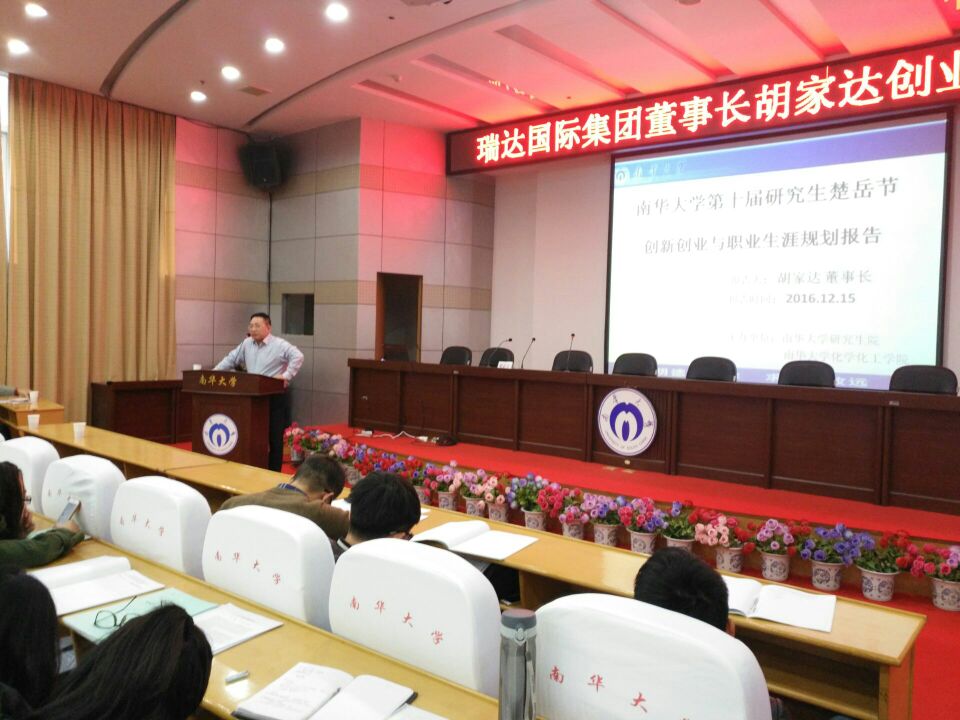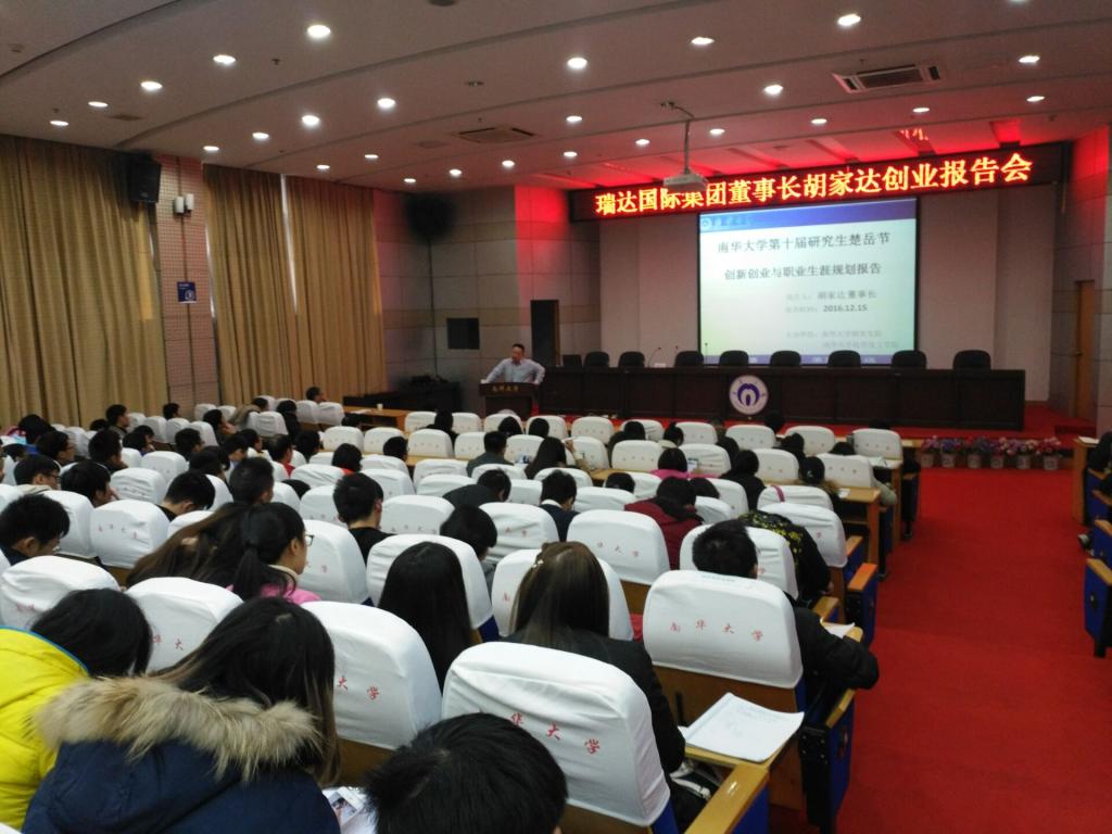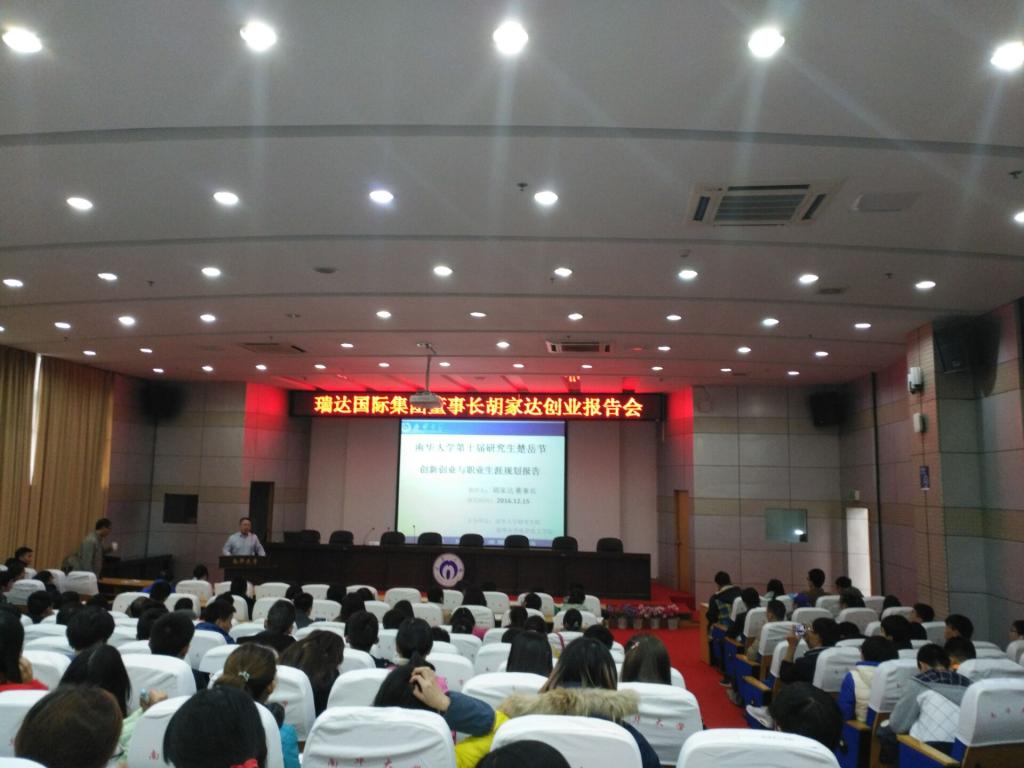 本次创业报告会由瑞达国际集团董事长胡家达主讲。他讲述自身艰苦、曲折创业的经历,一步一步让同学们明白就业与创业的不易,明白自身全方面发展的重要性。在当前我国严峻的就业形势下,就业问题困扰着许许多多的大学生,“低不成高不就”的问题更是屡屡皆是。创新与发展才是当代大学生应选的出路。“创业”可不是一蹴而就的,它要求当代的大学生具备更全面更顶尖的能力。创业是艰难的,我们需要容忍和忍受这个世界上的各种关系,甚至有的时候必须屈服于某种既定的规则、习惯和习俗,但我们的容忍和忍受不能变成只知道戳断自己脊梁骨,只知道自己一辈子在地上爬,而不知道人是可以站起来行走的灵魂。