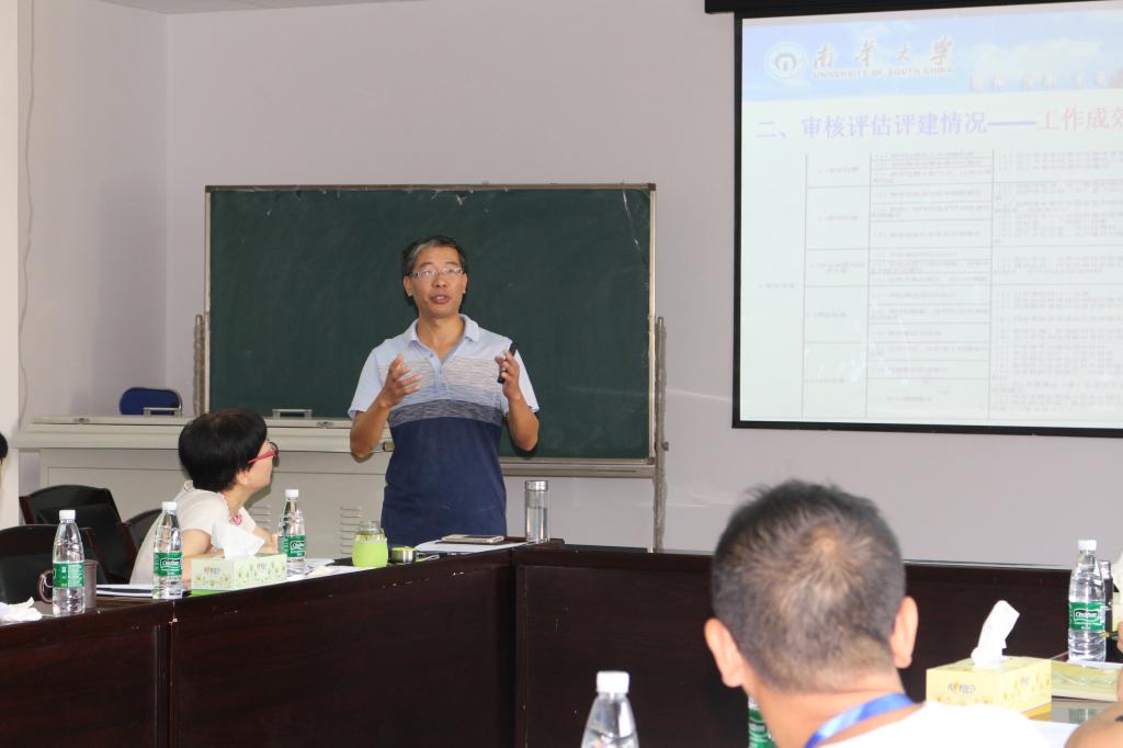 2017年9月27日上午,ok138cn太阳集团本科教学工作审核评估校内预评估报告会在南华大学红湘校区九教411多媒体会议室顺利举行。南华大学党委组织部部长苏玲,万艳萍教授,刘志明教授,邹国球教授一行四人专家组来到我院出席并指导本次报告会。院长王宏青,副院长刘慧君、林英武、赵玉宝,党委副书记余晓秋及我院未有教学工作的老师出席了本次报告会。