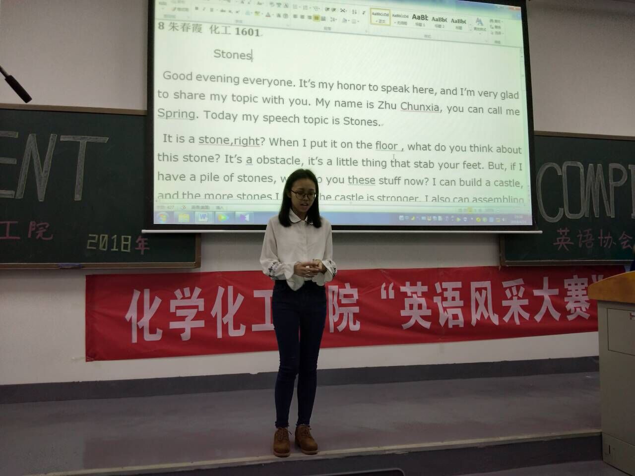 随着主持人热情洋溢的开幕词,倍受瞩目的比赛一触即发。本次比赛的选手分别是来自ok138cn太阳集团16、17级的、对英语表达有浓厚兴趣的同学。来自化学工程与工艺172班的廖晶晶作为首位登台的选手为带来的是演讲“Communication is wonderful”,引起大家强烈共鸣。而化学工程与工艺171班的于涛则为台下的观众们带来了倾情演唱,同学们纷纷为之喝彩。紧接着高分子材料工程161班的雷韩满怀热血,用他独一无二的演讲倡导“Communication with the world”,是的,交流不仅引人入胜,而且与世界的对话尤其重要。高分子材料工程171班的张澳环,她用精彩的演讲“The importance of keeping optimistic”诉说心态事关成败。此外,化学工程与工艺171班的宁锌檬的“Dere to dream”用另一国的语言和我们畅谈梦想,制药工程161班的刘心婷也用她的方式讨论了热门话题“Communication”,而化学工程与工艺161班的朱春霞和大家分享的则是一个平凡却感人的故事“Stones”,让人眼前一亮。化学工程与工艺161班的袁隆,无机金属材料工程171班的檀雨诺都用演讲比赛进一步地彰显英语的风采,化学工程与工艺162班的吴玲丽选择的,是动人心弦的歌声“All my past”来释放英语的魅力,感染受众。除此之外,还有制药工程171班的石咏琪用俏皮的声线为同学们演绎了电影《闪电狗》的配音,让许多同学捧腹大笑。