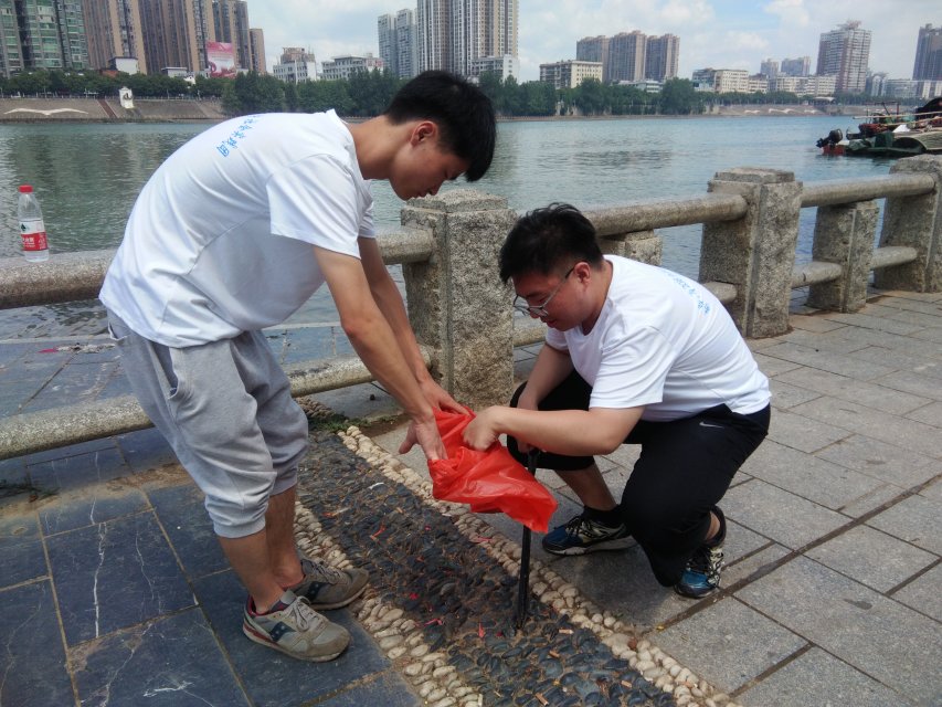 志愿者们分成两批,一部分人沿江清捡垃圾,为当地居民带去一份保护母亲河的意识。其余的志愿者们拿着提前准备好的实验设备对不同流域的水进行取样,回校后做水体分析,同时进行湘江保卫建设的问卷调查,针对不同人群询问情况,切实感受湘江生态环境建设的真实情况,调查的同时组织宣传水资源保护知识,增强居民的环保意识。