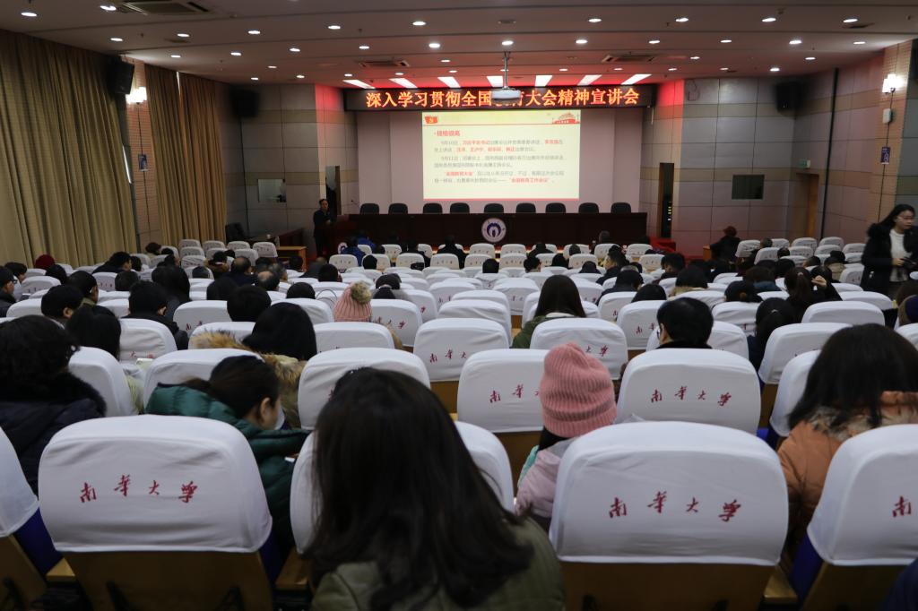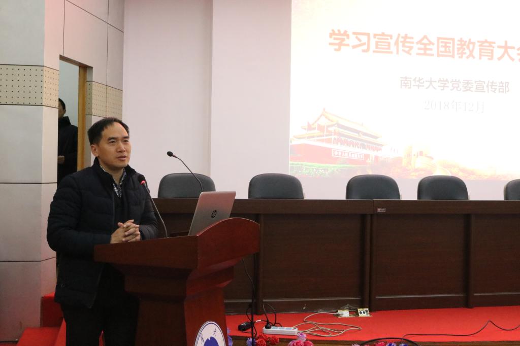 12月12日,在南华大学红湘校区图书馆报告厅举办了学习贯彻全国教育大会精神宣讲会,大会由雷小勇副校长主讲。各学院领导、老师均到场学习。