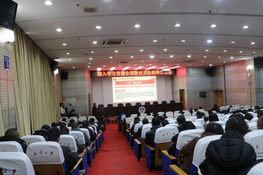 这次全国教育大会是在中国特色社会主义进入新时代、以习近平同志为核心的党中央决定召开的第一次全国教育大会,意义重大、影响深远。大会在新的历史起点上开启了新时代教育事业新征程,全面深刻阐释了新时代教育改革发展重大理论和实践问题,为新时代教育改革发展的伟大实践指明了方向,对加快推进教育现代化、建设教育强国、办好人民满意的教育进行了全面系统部署。要求与会人员要充分认识这次会议的重大意义,切实把思想和行动统一到全国教育大会精神上来,深入理解“九个坚持”,领会把握“六个下功夫”,深刻理解总书记对教师和教师工作的论述,结合我们南华大学工作实际,以扎扎实实的行动写好新时代教育改革发展的奋进之笔。