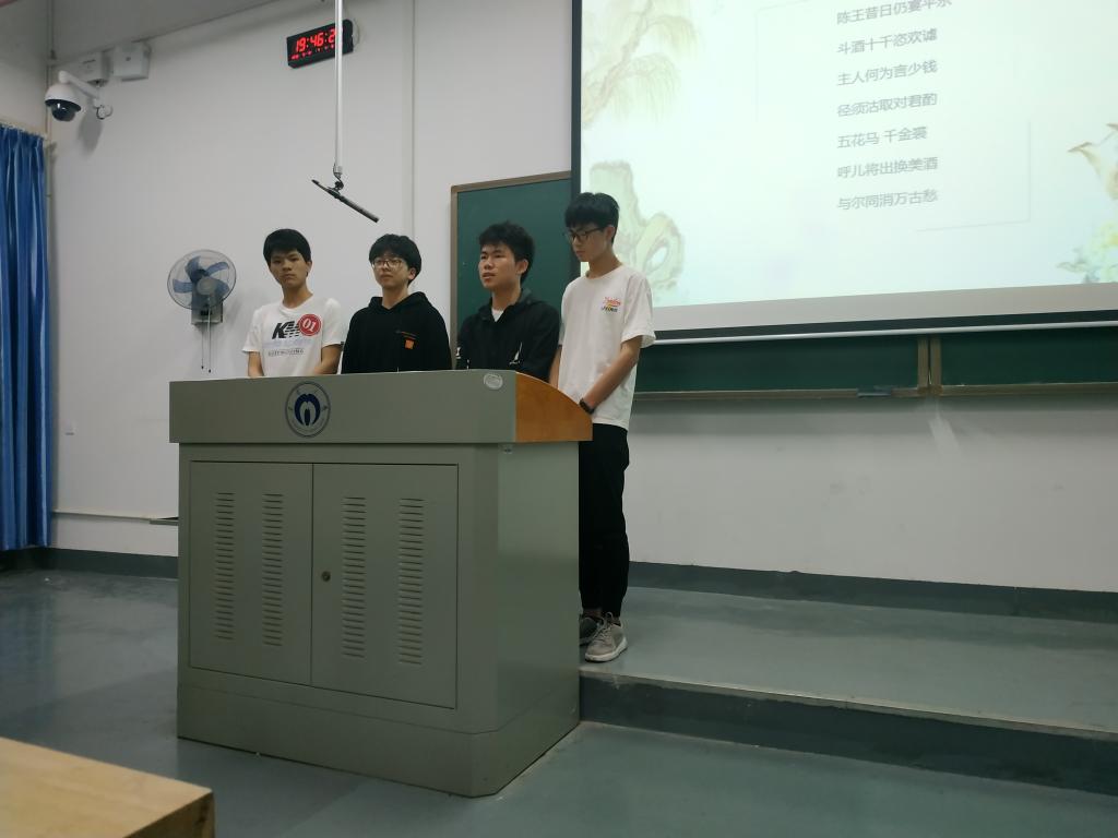比赛途中,选手们表现的十分优秀,声情并茂地将自己的作品展示给评委和观众看。首先是由高材183班汤应强小组四人带来的一首《将进酒》,大气磅礴,随后是语言文学学院带来的《乡愁》,细腻而委婉。粗犷与婉约碰撞,气势与柔美并存。紧接着语言文学学院团委副书记李顿楷点评道,每一位选手的特点鲜明,可是在某些细节如幻灯片的展示方面还存在一些不足。