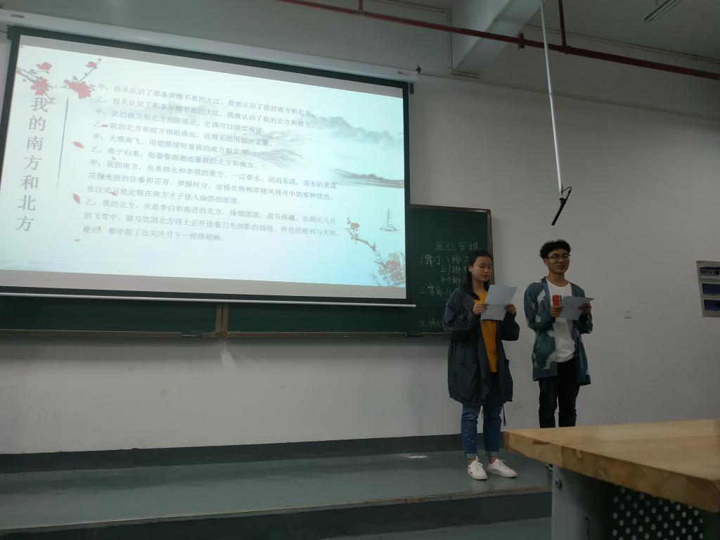 随后语言文学学院一首《满江红》燃起了在场每一位观众的热血,紧随其后来自高材184班薛金祥小组的一首《我的南方和北方》拨动了每一个游子的心,随着四川方言与巴盟方言的转换,一幅幅南北方的瑰丽场面如走马灯般浮现在眼前,乡音撩人。
