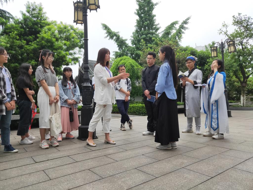 室内教学结束后,同学们在旅游服务部部长周旸的带领下,开始了现场讲解工作的培训。周旸给同学们详细的介绍了石鼓书院每个景点的历史背景,同时也教授了志愿者们一些讲解技巧,同学们也十分配合,也对培训内容认真的做了记录。在室外培训结束之前,四位同学们在孔子像旁穿上汉服进行与石鼓书院相关联的诗句的朗诵活动,这充分展现了新时代青年的朝气与蓬勃。最后此次合作仪式的参与人员在大观楼和山门前合影留念,用照片记录本次合作仪式的举行。走出书院出口处,检票处负责人倪晓捷对同学们进行了有关票务知识的培训,此次合作仪式完美落幕。