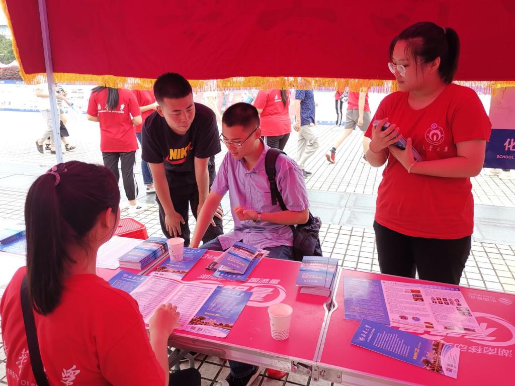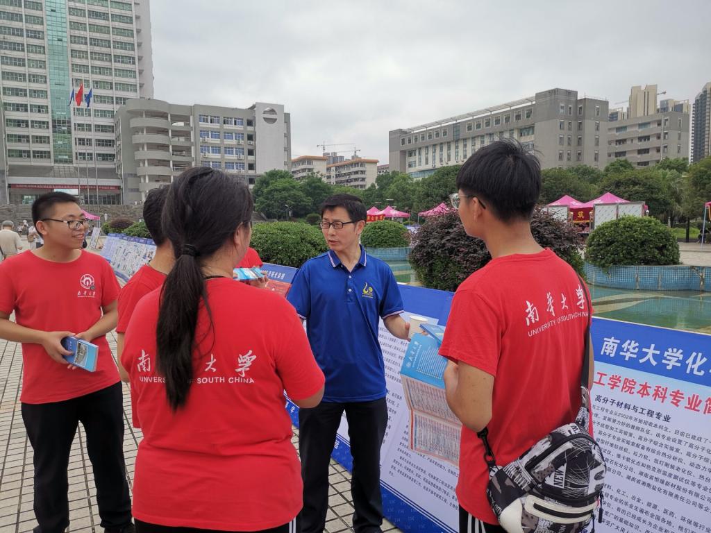 林英武书记亲切的与前来咨询填报志愿的家长介绍了ok138cn太阳集团自身的学科优势,耐心的与家长讲解ok138cn太阳集团的就业前景。三十余名身着“南华大学”文化衫的我院各专业学生代表组成了志愿者队伍,积极为来访学生和家长介绍我院专业信息,答疑解惑。来访学子与家长均对我院出展展台表示出了浓厚的兴趣。在光明大直播展示中,在我院老师与志愿者们整齐而又响亮的“春风化雨,化工等你”口号中,活动迎来了高潮。