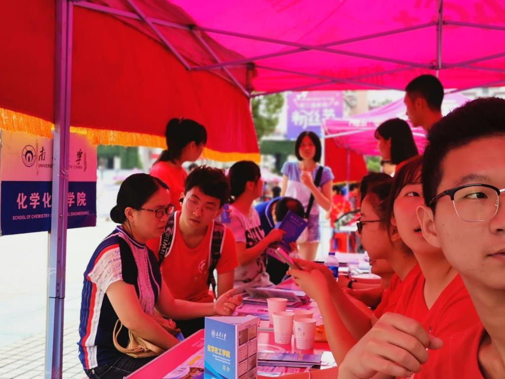 6月22号,为了促进广大高考考生以及家长对南华大学2019年本科招生的了解,吸引更多的优秀生源。南华大学2019年校园开放日活动在红湘校区南华广场正式拉开序幕,此次校园开放日活动分四个部分,第一部分为在图书馆学术报告厅举行2019年本科生招生信息发布会,第二部分是各学院在南华广场的展位家长、考生面对面咨询,第三部分为“学长学姐带你游南华”校园参观,由相关志愿者引导学生和家长参观学院、实验室、图书馆、学生宿舍、食堂等,最后一部分是“光明大直播走进南华”系列活动。