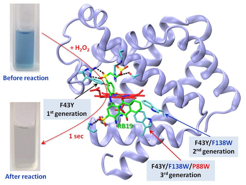 人工金属酶分子设计一直是国际化学生物学研究领域中的热点和难点。近日,我院林英武教授科研团队在人工染料脱色过氧化物酶分子设计研究领域取得重大研究进展。该团队利用常见的肌红蛋白作为分子框架,成功设计出第三代人工染料脱色过氧化物酶分子,其催化活性可与天然生物酶相媲美,能在数秒内将高生物学毒性的染料活性蓝RB19催化褪色(下图)。