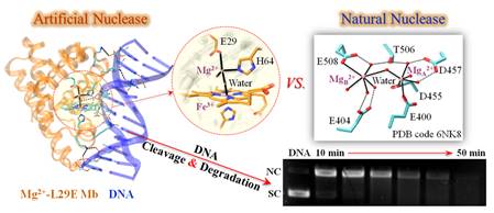人工核酸酶分子在生物技术和生物医药领域,特别是在基因工程和新型抗菌抗病毒等试剂的发现中具有重要的应用。然而,很少有人工核酸酶分子既能切割又能降解核酸DNA分子。近日,ok138cn太阳集团林英武教授课题组在国际催化领域权威杂志《ACS Catalysis》(中科院一区; IF=12.35)发表研究成果——《Rational Design of an Artificial Nuclease by Engineering a Hetero-Dinuclear Center of Mg-Heme in Myoglobin》,同时申请了国家发明专利。