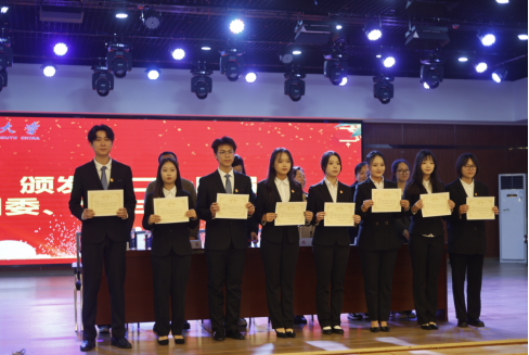 院党委副书记余晓秋、院学工室主任陈楠、院学工室全体辅导员为新一届学生干部颁发聘书。