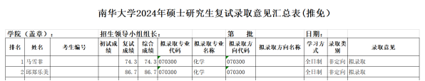 按照学校及我院研究生招生工作的复试方案,根据2024年09月29日的复试成绩排名,现公布最终拟录取名单如下。研招网发送录取通知如超过4小时未确认视为放弃。对复试成绩及上述同学的建议录取有异议,请以书面形式于2024年10月03日前向学院反映。反映情况要实事求是,具体真实,署真实姓名,以便调查核实。电话:0734-8282375,联系人:王老师。