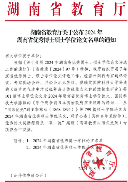 2024年8月30日,湖南省教育厅公布2024年湖南省优秀博士硕士学位论文名单,其中我院林英武教授团队的毕业研究生陈蕾、郭文杰和王宏青教授团队的毕业研究生李跃欢荣获2024年湖南省优秀硕士学位论文。近年来我院高度重视研究生培养工作,多措并举加强研究生教育,并取得了可喜的成绩。