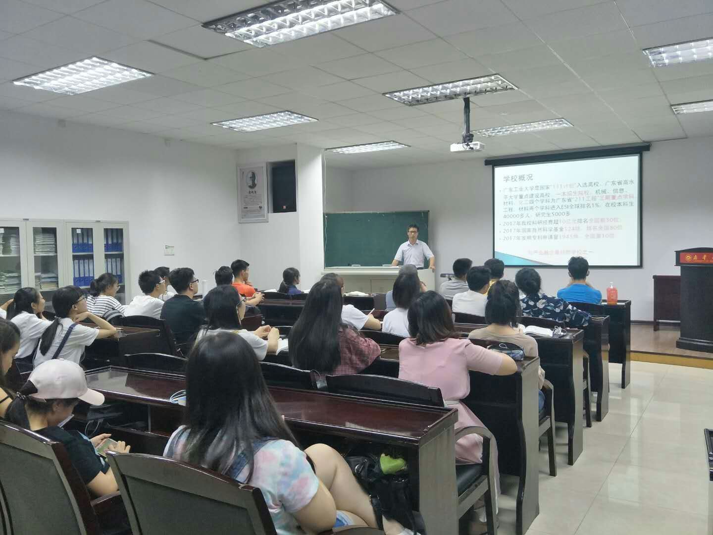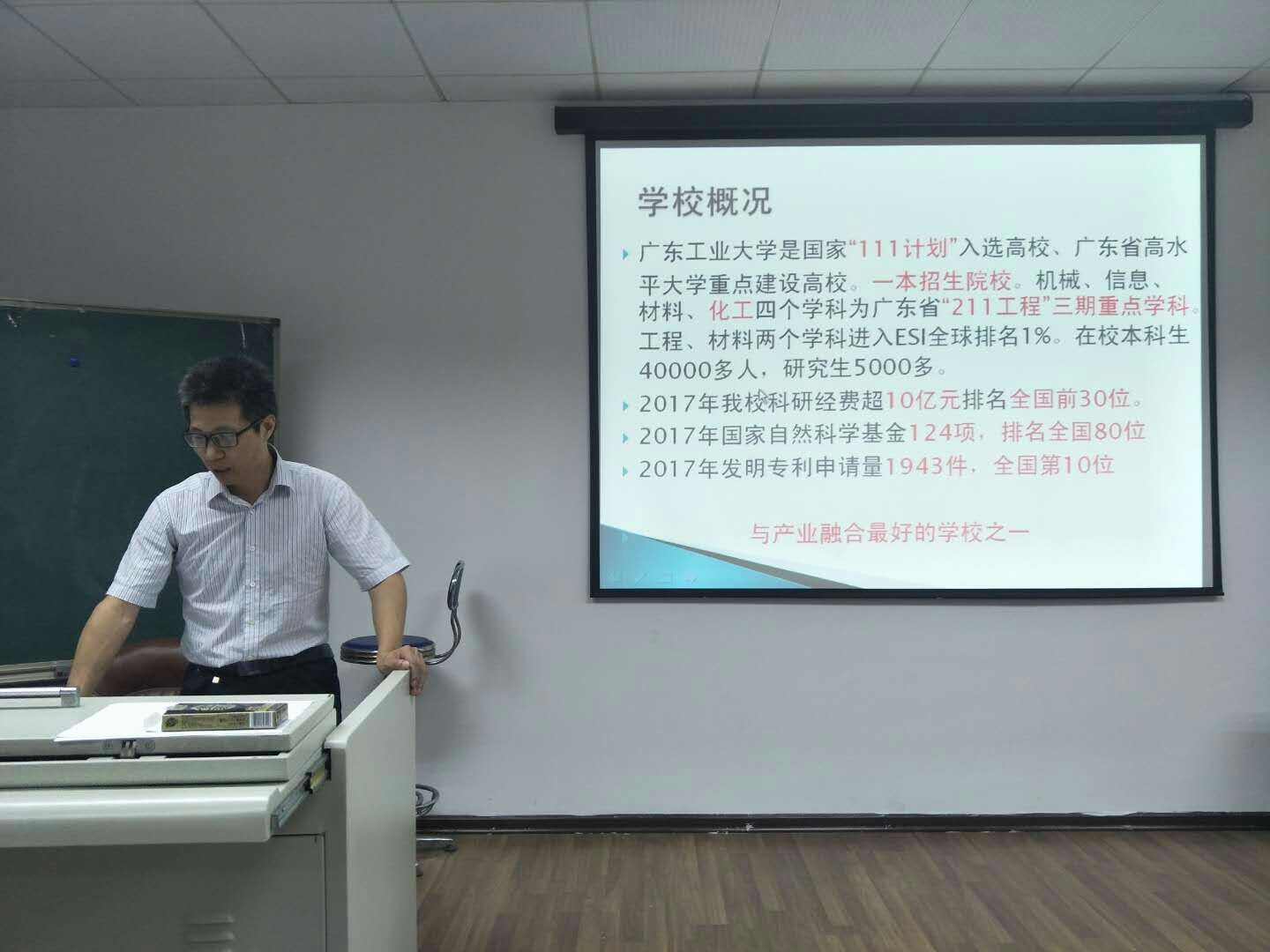 赵素清教授简单的介绍了广东工业大学的学校概况:广东工业大学是国家“111计划”入选高校、广东省高水平大学重点建设高校,一本招生院校。机械、信息、材料、化工四个学科为广东省“211工程”三期重点学科工程、材料两个学科进入ESI全球排名1%。在校本科生40000多人,研究生5000多。重点讲解了广东工业大学轻工化工学院及研究生招生政策,最后答疑环节教授和学生交流甚欢。
