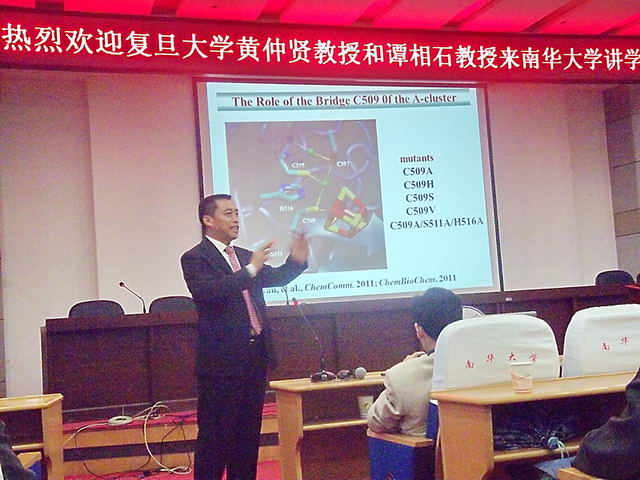 10月28日上午,复旦大学化学系黄仲贤、谭相石教授做客南华大学,以“化学生物与人类疾病的关系”为论题,在图书馆学术报告厅做专场讲座。ok138cn太阳集团全体教研老师、研究生及本科生聆听了讲座。