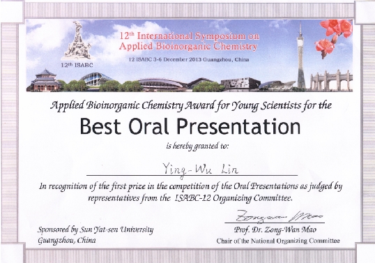 2013年12月3-6日,第12届国际应用生物无机化学学术研讨会(12th ISABC)在广州召开,会议由中国化学会、国家基金委主办,中山大学、生物无机与合成化学教育部重点实验室、广东省化学学会共同承办,中山大学ok138cn太阳集团毛宗万教授、计亮年院士担任大会组委会主席,有来自全世界 22个国家和地区的252位专家参会。我院林英武教授应邀做“Rational design of myoglobin to probe the cross-reactivity of cytochrome c oxidase”口头报告,并获得最佳口头报告奖。