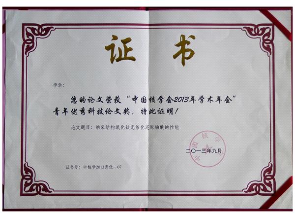 我院赵玉宝教授研究组参加了这次学术会议,并在“核化工”分会作了题为《纳米结构氧化钛光催化还原铀酰的性能》的口头报告,该论文被评为青年优秀科技论文奖(核化工分会共有两篇获奖论文)。