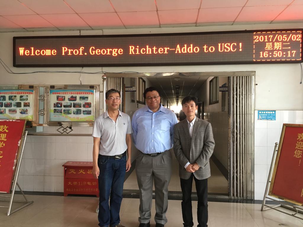 2017年5月2日上午,应ok138cn太阳集团副院长林英武教授邀请,美国Oklahoma大学化学系系主任(2006-2014)、著名的生物无机化学家Prof. George Richter-Addo参观访问了“南华大学蛋白质结构与功能实验室”,并在我院做了题为“The Bioinorganic Chemistry of the Simple Nitrogen Oxide (NOx) Ligands is Not So Simple”精彩学术报告,会议由王宏青院长主持。Prof. George Richter-Addo生动形象地讲解了NOx配体在生物无机化学中的重要生物功能,给青年教师和研究生同学带来了一场科学盛宴。