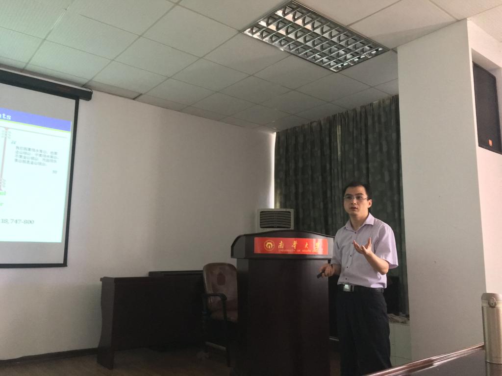 2018年5月25日上午,应ok138cn太阳集团党委书记林英武教授邀请,湖南科技学院化学与生物工程学院副教授来我院进行学术访问,并做了题为“绿色反应介质在有机合成中的应用”精彩学术报告,会议由王宏青院长主持。会后何博士参观了“南华大学蛋白质结构与功能实验室”。何卫民博士近年来主持国家自然科学基金、博士后基金等,发表高水平论文30余篇,包括JACS、Green Chemistry (6篇)等国际著名期刊,获得国家发明专利多项。