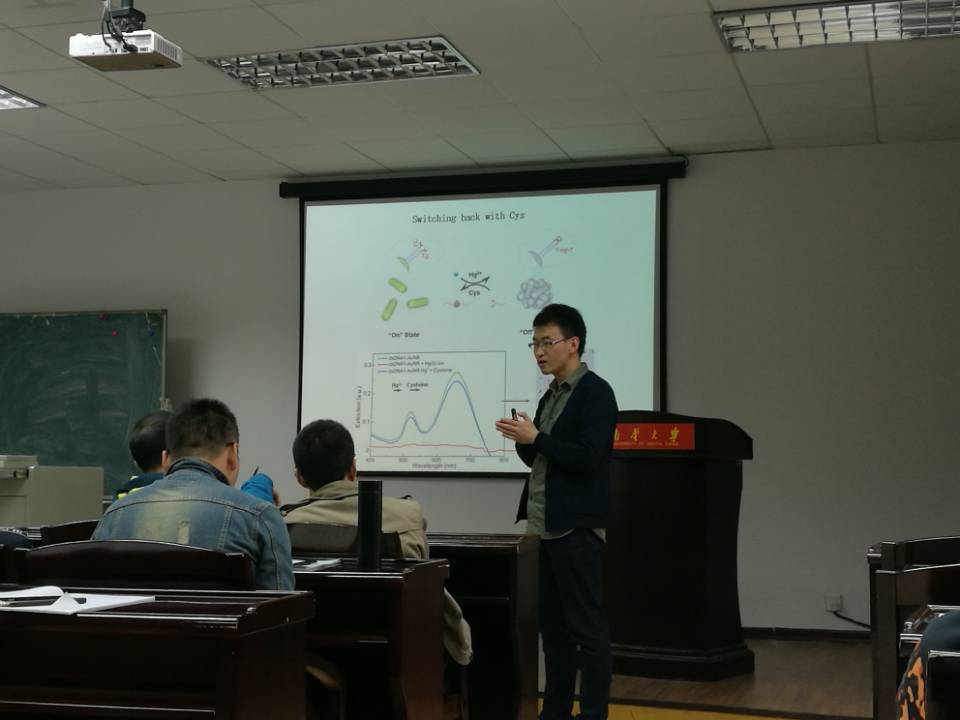 4月29日下午,中国海洋大学王国庆教授访问ok138cn太阳集团,并在9教411学术会议报告厅作了题为“金纳米结构的等离子体光学性质调控:自组装 VS 晶体生长”的学术讲座。讲座由化学化工院党委书记林英武教授主持,化工学院部分领导和教师,以及约50名研究生参加并聆听了此次讲座。