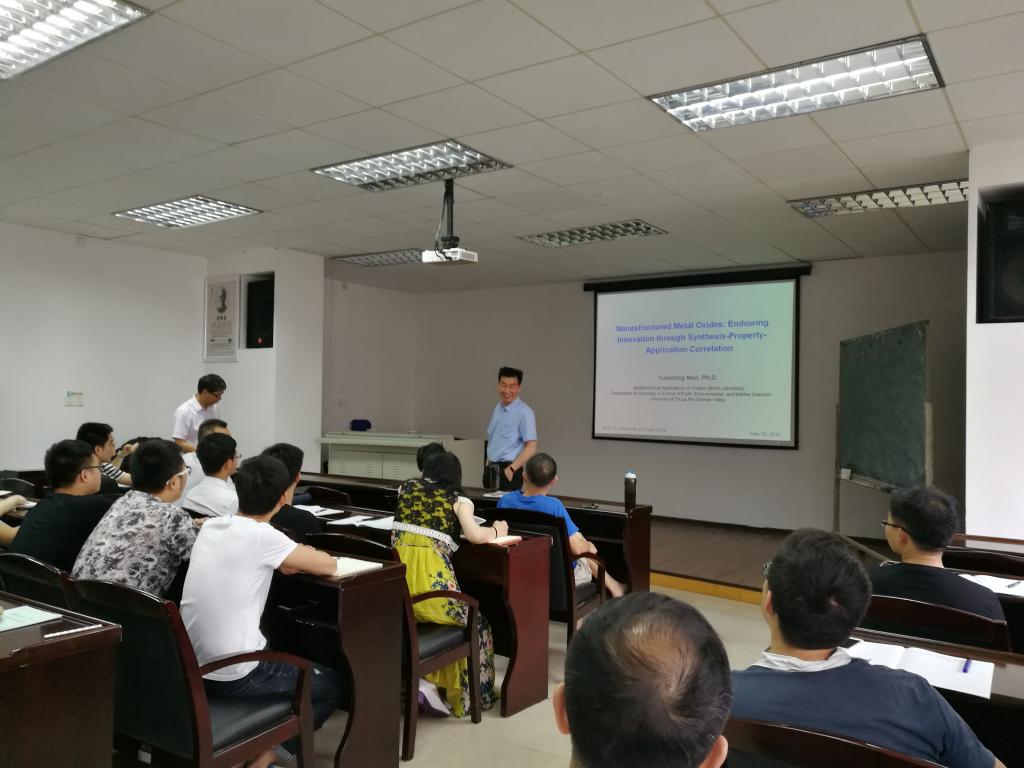 5月27日下午,美国德克萨斯里奥格兰德河谷大学(University of Texas Rio Grande Valley)毛园兵教授访问ok138cn太阳集团,并在9教411学术会议报告厅作了题为“Nanostructured Metal Oxides: Endowing Innovation through Synthesis-Property-Application Correlation”的学术讲座。讲座由化学化工院院长王宏青教授主持,化工学院部分领导和教师,以及约50名研究生参加并聆听了此次讲座。