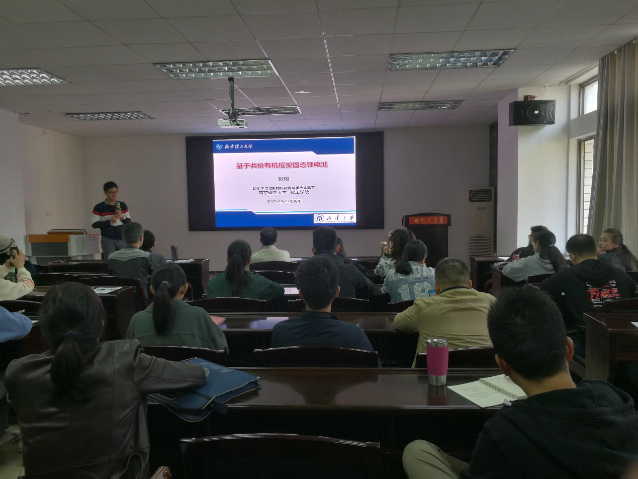 2020年10月22日上午9点,由科学与学科建设部主办、化学与化工学院承办的“南华大学合并组建20周年暨建校62周年系列学术讲座”,邀请到张根教授在化工楼411学术报告厅作了题为《基于共价有机框架固态锂电池》的专题报告,报告由化学化工学院院长林英武教授主持,化工学院和其他院系教师以及研究生等60余人聆听了本次讲座。