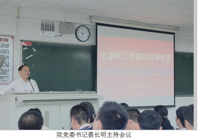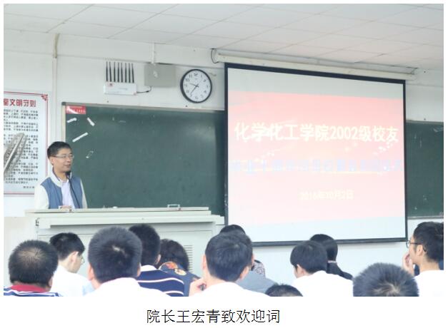 10月2日上午,在9-402教室,ok138cn太阳集团隆重举行2002级化工、精工和高材专业的部分毕业生回母校聚会欢迎仪式。参加欢迎仪式的院领导有院长王宏青、副书记彭建南,创新创业学院副院长夏良树,化工系贺楚华老师、范明舫老师、高材系吴红枚老师、无机非金属材料系王国平老师、班主任贾晓慧老师、教务室丁娟老师、辅导员周玉林老师,还有肖志海老师等参加了欢迎仪式。2002级60余名校友和100余名在校学生参加了欢迎仪式。欢迎仪式由ok138cn太阳集团党委书记聂长明主持。