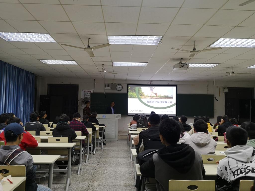 作为校友的陈治,从企业文化切入让同学们全面了解本公司、所在岗位的要求以及本公司的团队。接下来由浙江普洛康裕制药有限公司招聘经理姚方军着重介绍制药企业的发展趋势。他认为相对于其他工作领域来说,医药方面是朝阳产业。对于岗位的选择,姚方军认为:人要有不同的可能性,要勇于尝试或接受不同的岗位,让自己的人生多一种可能,要与自己的舒适圈保持距离。最后由公司行政人事部副部长杨倩在工作方面向同学们提出建议:兴趣是最好的老师,在生活中要常存热情与兴趣,在工作中要有负责与耐心。杨倩讲述了自己多年来工作的经历,从父母安排的“铁饭碗”到自己自主创业,在成功的背后肩负着多少的付出,蕴含着多大的勇气。她向同学们说道:青年要敢于拼搏要有血性,我们正当青春,应该追随自己的内心,要敢于尝试。
