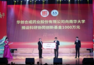 正值南华大学建校65周年,10月15日晚,南华大学建校65周年艺术展演在红湘校区南华礼堂隆重举行。在晚会现场的校友捐赠仪式中,华创合成药业股份有限公司总经理贾树田先生受其公司董事长、ok138cn太阳集团1997级化工专业校友杨成先生委托,向母校捐设科研协同创新基金1000万元。
