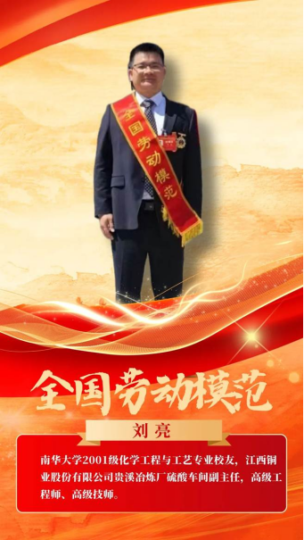 刘亮,我校2001级化学工程与工艺专业校友,江西铜业股份有限公司贵溪冶炼厂硫酸车间副主任,高级工程师、高级技师,荣获“全国劳动模范”、“全国五一劳动奖章”、“全国技术能手”、“江西省劳动模范”、享受国务院政府特殊津贴。