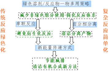 以绿色化学第一原则,即“防止废物产生优于废物产生后再处理”为出发点,以实现传统合成反应绿色化和复杂反应简单化为目标。通过巧妙设计使绿色溶剂或反应物在合成反应中发挥多重作用,减少非绿色组分的使用,简化合成体系;通过设计串联反应,避免衍生化反应,减少分离纯化工序;利用自分相分离策略,实现产物的清洁分离,避免分离纯化过程使用化石溶剂;运用新能量传递方式,解决反应的传质传热问题,提高能源效率,建立了系列清洁有机合成新方法。