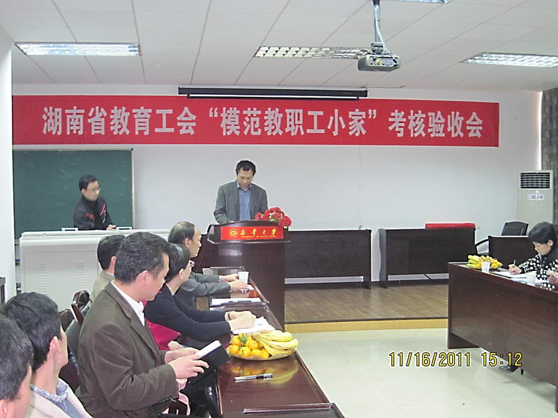 2011年11月16日下午,南华大学工会常务副主席朱惠延教授、校工会副主席李国彦同志和工会文体委员何桂华同志等一行4人受湖南省教育工委工会的委托来到ok138cn太阳集团,对ok138cn太阳集团申报的湖南省“模范职工之家”项目进行考核验收。会议由朱惠延教授主持,ok138cn太阳集团领导班子全体成员、分工会委员及10余名会员代表参加了会议。