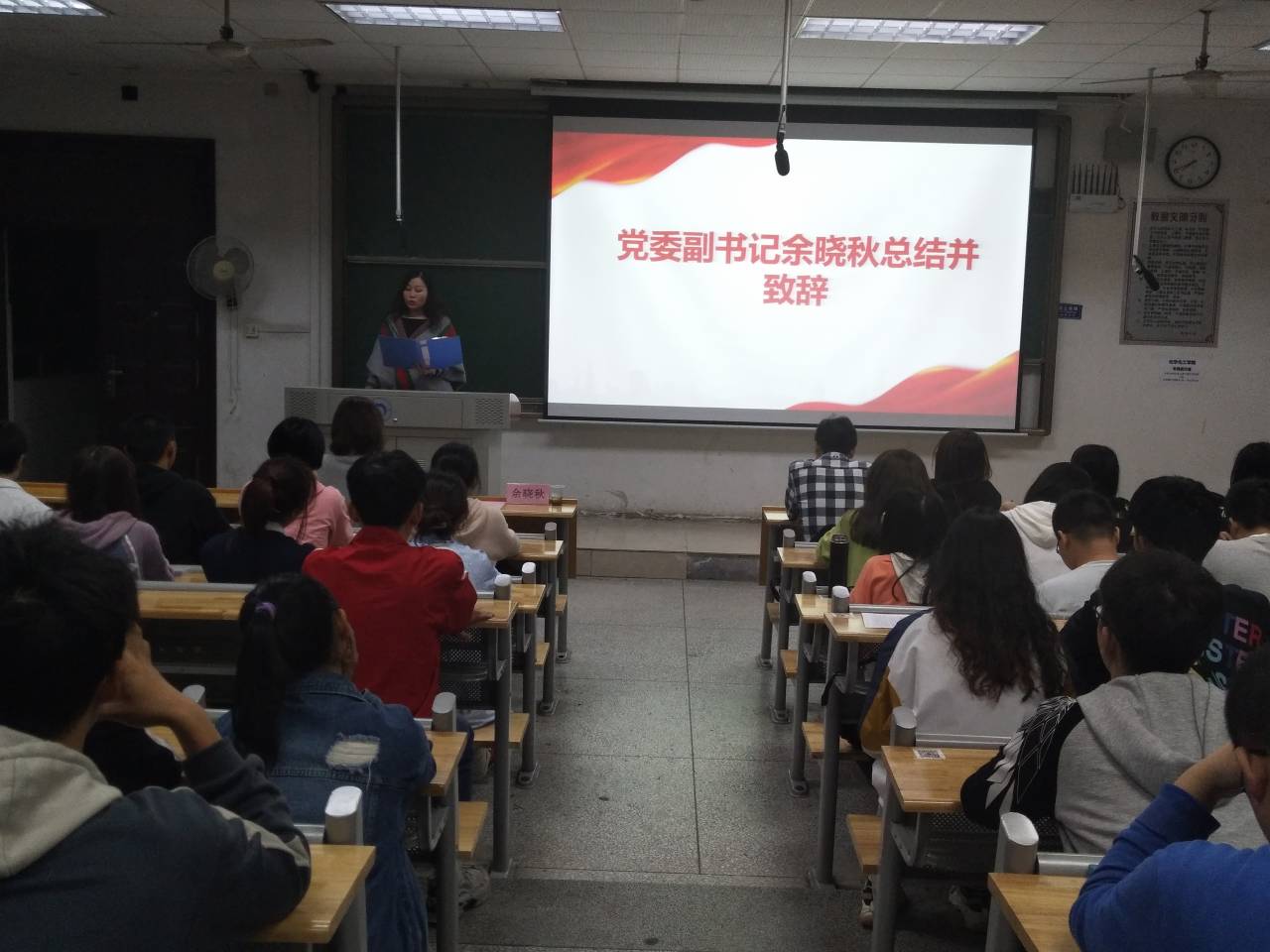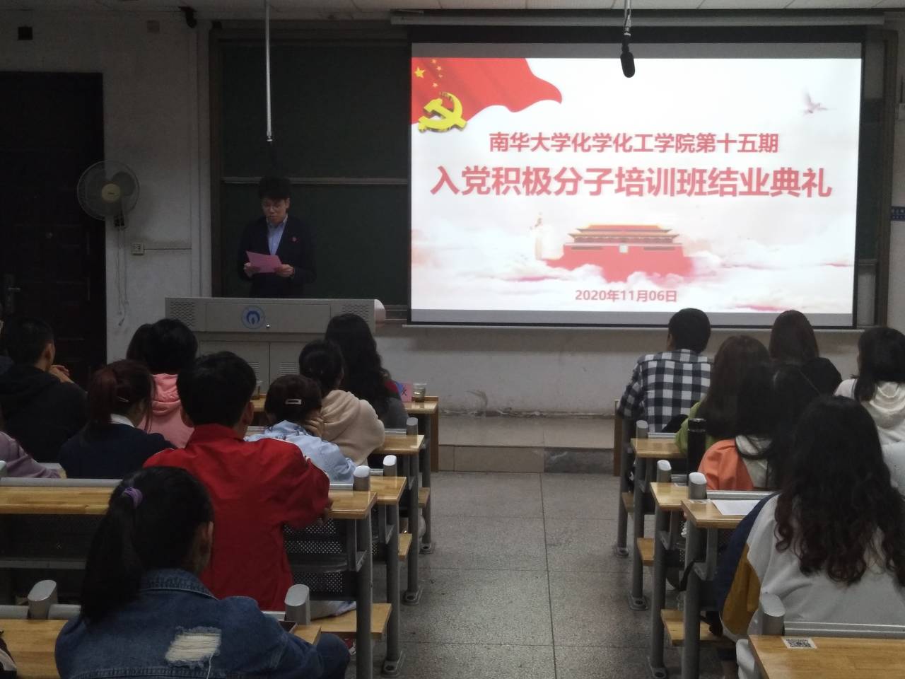 11月6日晚,南华大学ok138cn太阳集团于红湘校区化工楼401教室举办2020年秋季入党积极分子培训结业典礼。院党委副书记余晓秋、制药及高材学生党支部书记陈楠、化工及无机非学生党支部副书记颜晔以及培训班学员参与此次典礼。此次会议由颜晔主持。